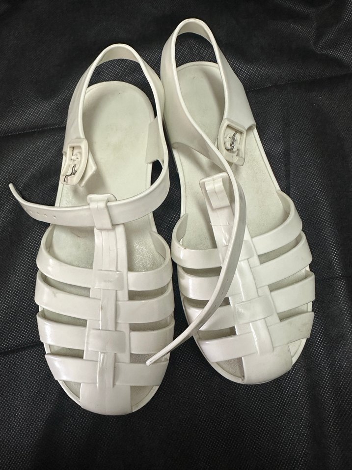 Kızlar için beyaz renkte, tokalı kauçuk terlik. Hafif ve desensiz, sokak stili için uygun.