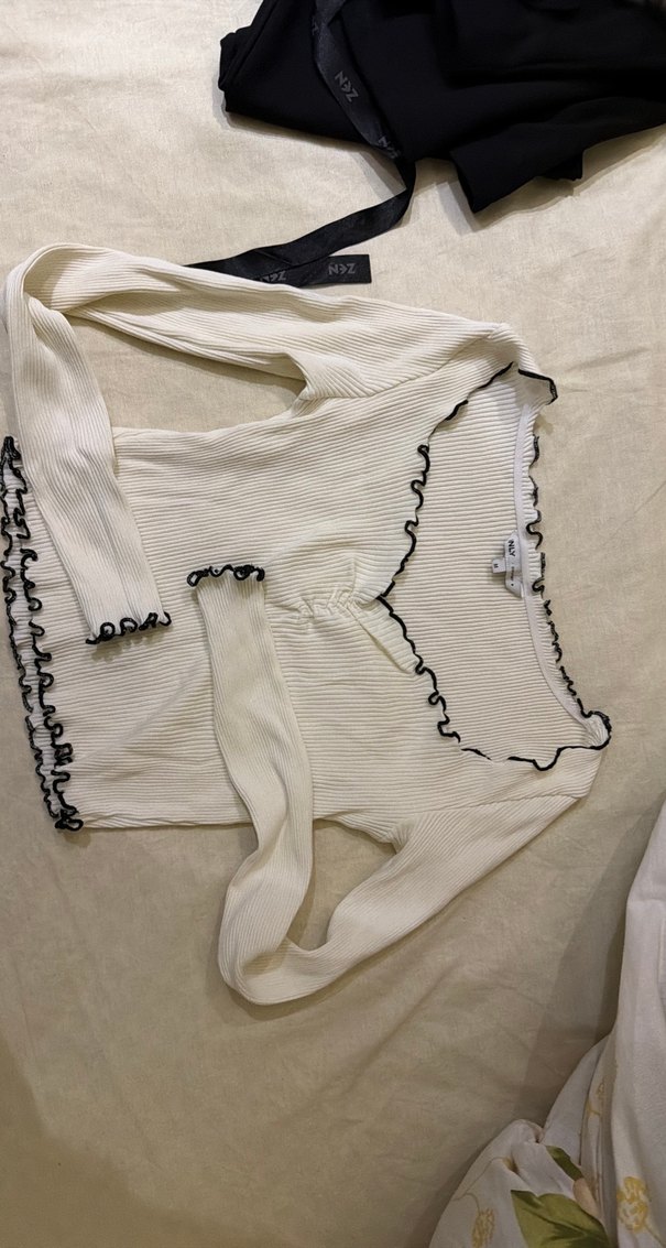 Beyaz, uzun kollu, ince kesim kız bluzu. Pamuklu, bel detaylı ve siyah kenar süslemeli, şık sokak stili için uygundur.