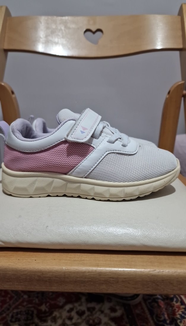 Kızlar için beyaz ve açık pembe renklerde, kolay bağlanabilen velcro bantlı spor ayakkabı. Kauçuk tabanlı ve nefes alabilir üst kısmı ile günlük sokak stiline uygun. Torex marka, flodan alındı.
