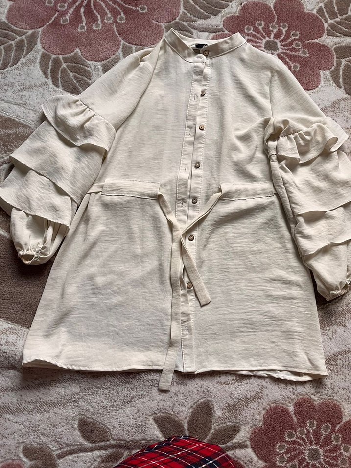 Kızlar için bol kesim beyaz keten bluz, yüksek yakalı, düğmeli ve kat kat volanlı uzun kollu. Bohem tarzda, yumuşak pastel tonlarında.