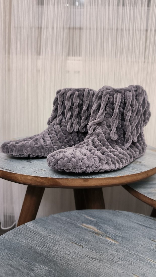 Kızlar için bohem tarzda, yumuşak örgü dokusuna sahip gri sıcak ev terliği. Rahat ve sıcak tutar.