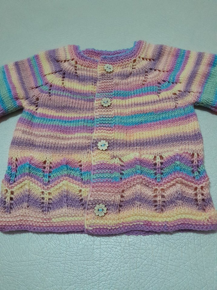 Pastel çok renkli, uzun kollu, bol kesim kız hırkası. Yumuşak örgü kumaştan, bohem tarzda, çiçek şeklinde düğmelerle süslenmiş.