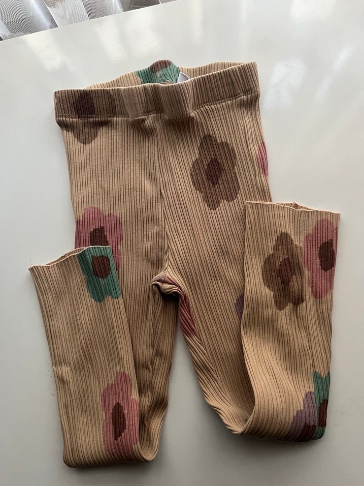 Bej renkte, piliseli dokusu ve pastel bağlama desenli çiçekleri olan, bohem tarzda kız çocuk taytı. Yumuşak sentetik kumaştan üretilmiştir.