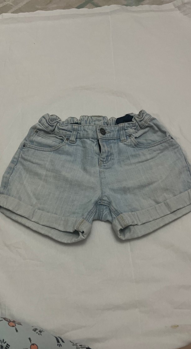 Kızlar için düğmeli, bol kesim kot şort. Bej ve gri tonlarda hafif batik desenli, rahat sokak stili için uygun. Belinde ayarlama yeri var