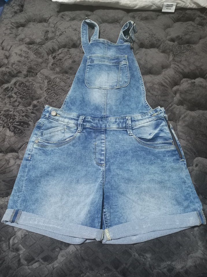 Kemerli, batik desenli, bol kesim, kot kumaştan kız tulumu. Kolsuz ve sokak stiline uygun.
