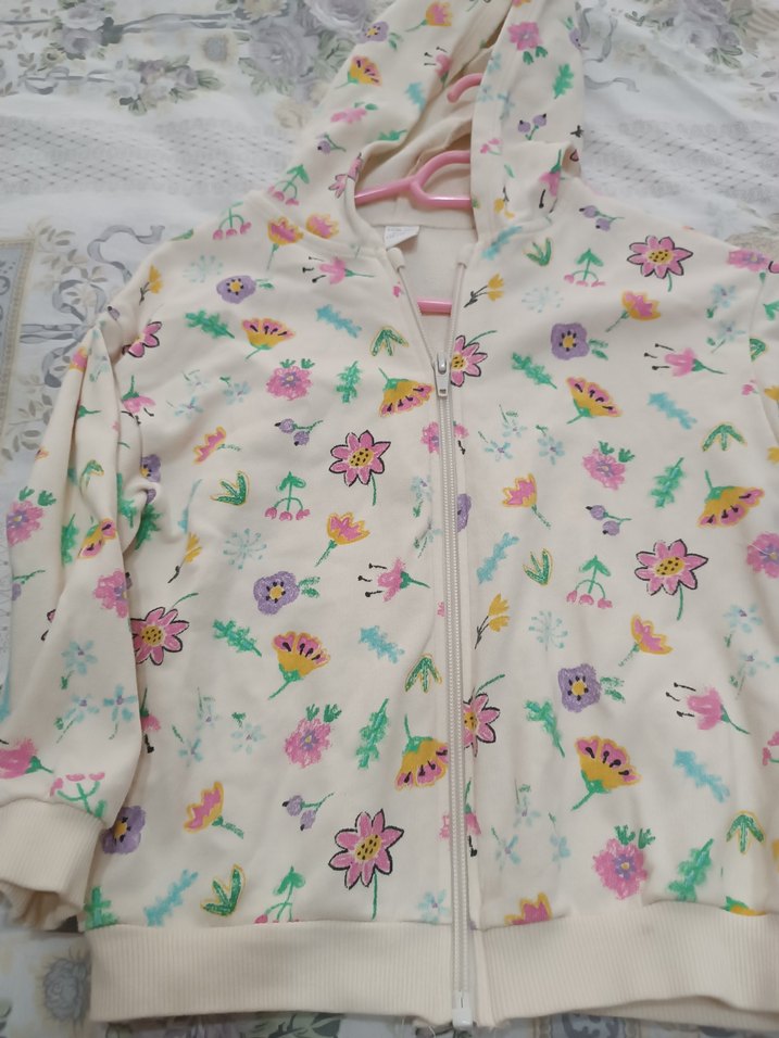 Bu bol kesim kız sweatshirtü, beyaz zemin üzerine pastel çiçek desenlerine sahiptir. Uzun kollu, kapüşonlu ve önünde fermuar bulunur, yumuşak kumaştandır. 5 6