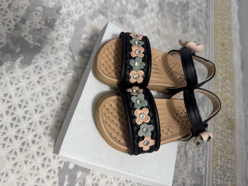Kızlar için tokalı, çiçek desenli siyah bantlı, rahat kauçuk tabanlı, bohem ve retro tarzda terlik.