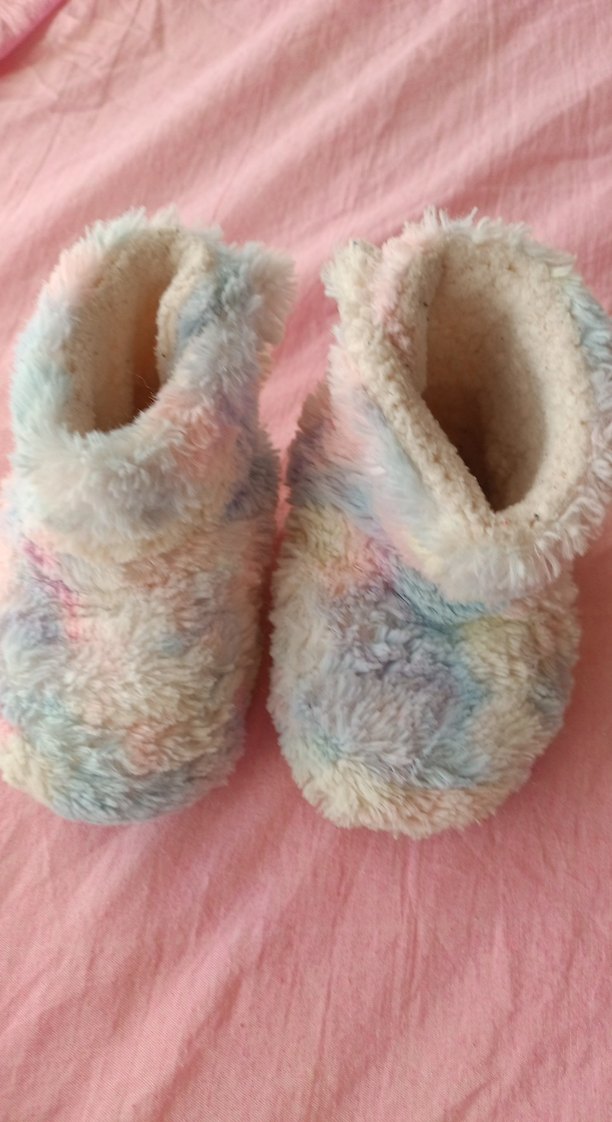 Kızlar için çok renkli pastel bağlama desenli, yumuşak kürk detaylı sıcak ev terliği. Bohem tarzına uygun.