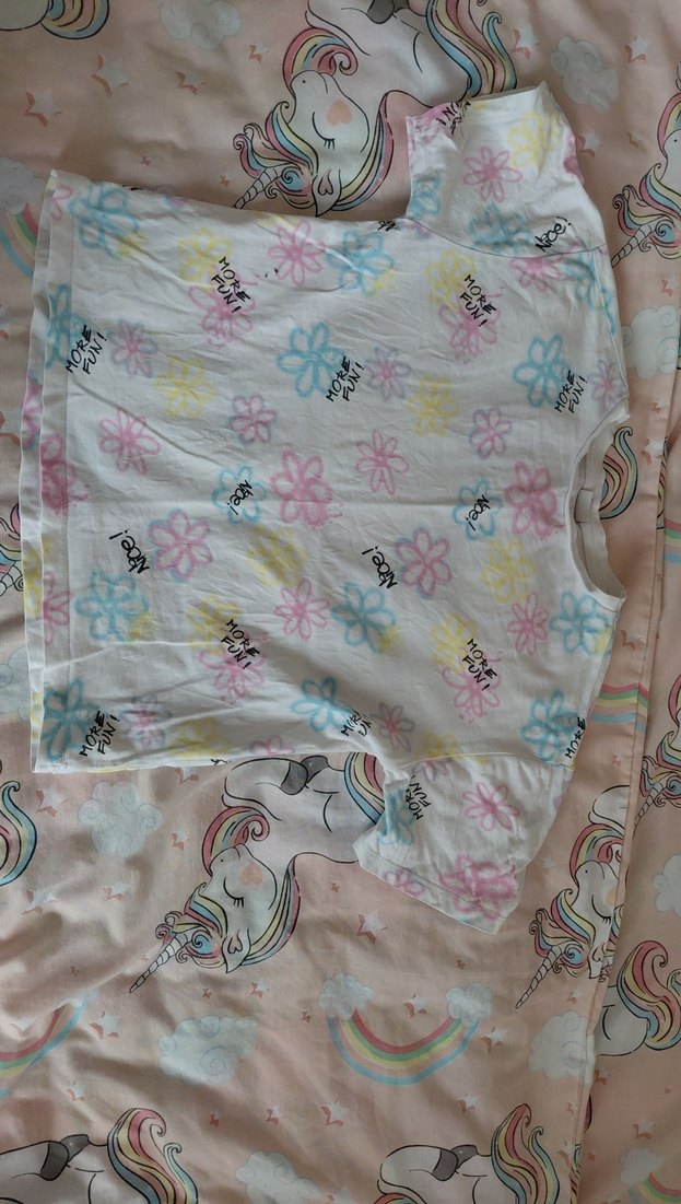 Kızlar için pamuklu, bol kesim kısa kollu, tekne yaka tişört. Pastel bağlama desenli, fırfır detaylı, bohem sokak stili için uygun.