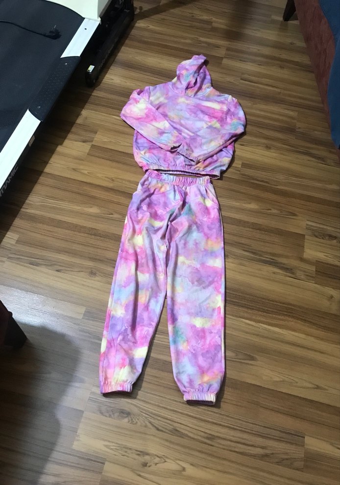 Kızlar için bol kesim, pastel çok renkli batik desenli eşofman takımı. Uzun kollu, kapüşonlu ve dökümlü stilde, yumuşak sentetik kumaştan yapılmıştır.
