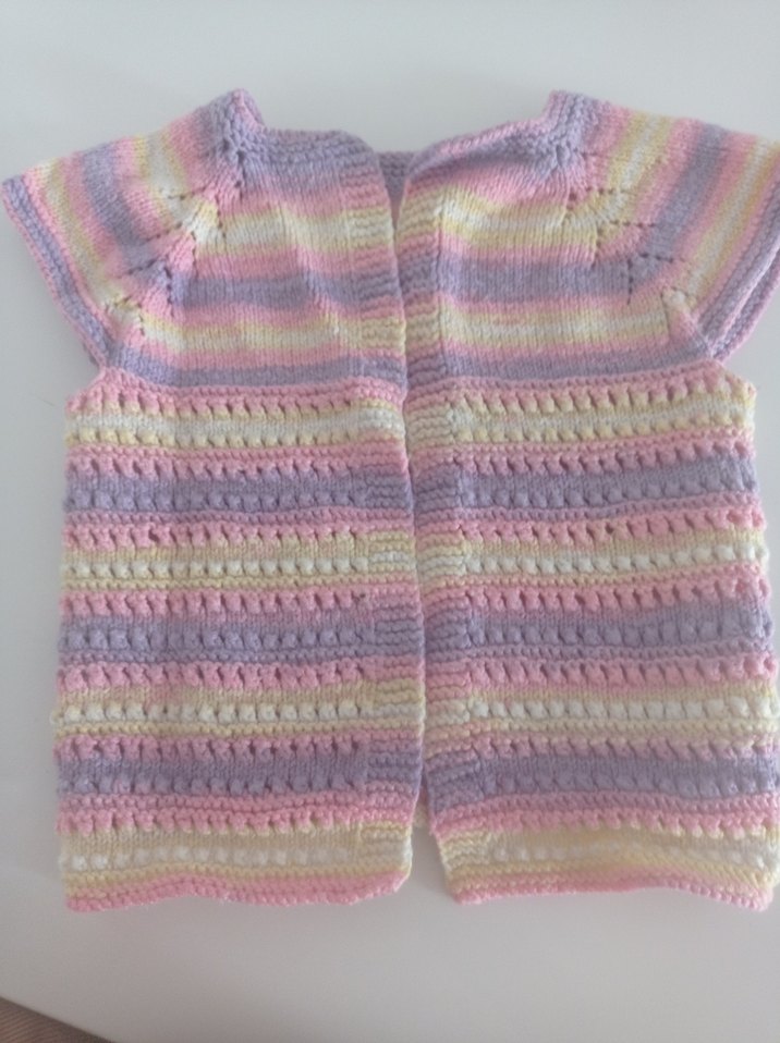 Kısa kollu, bol kesim bohem tarzda kızlar için pastel çok renkli yumuşak örgü hırka. Desensiz, zarif örgü dokusu bulunur.