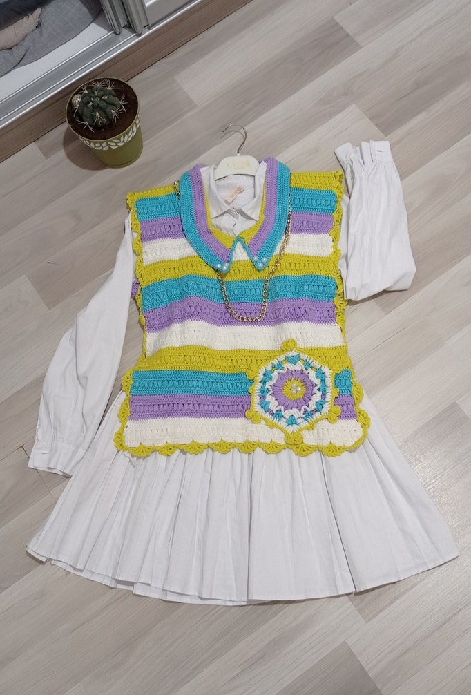 Bu kolsuz örgü yelek, bol kesim, pastel tonlarında batik desenler ve yakalı tasarımıyla bohem tarzı için uygundur.