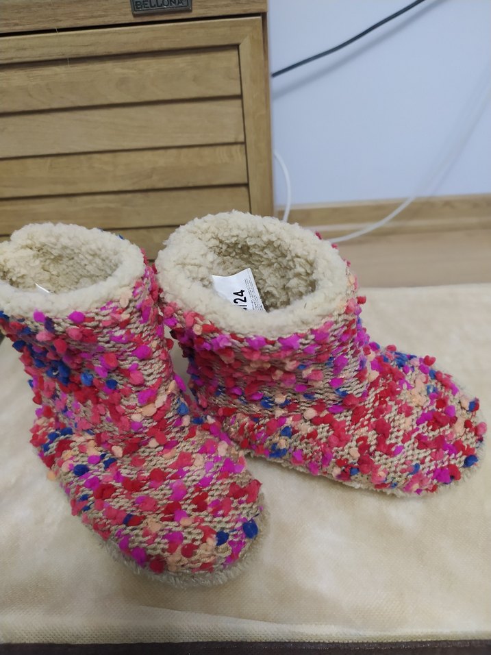 Kızlar için çok renkli örgü ev terliği, yumuşak ve peluş iç astar ile sıcaklık sağlar. Bohem tarzına uygun renkli tie-dye deseni bulunur. Altı kaydırmaz taban. 23/24 no