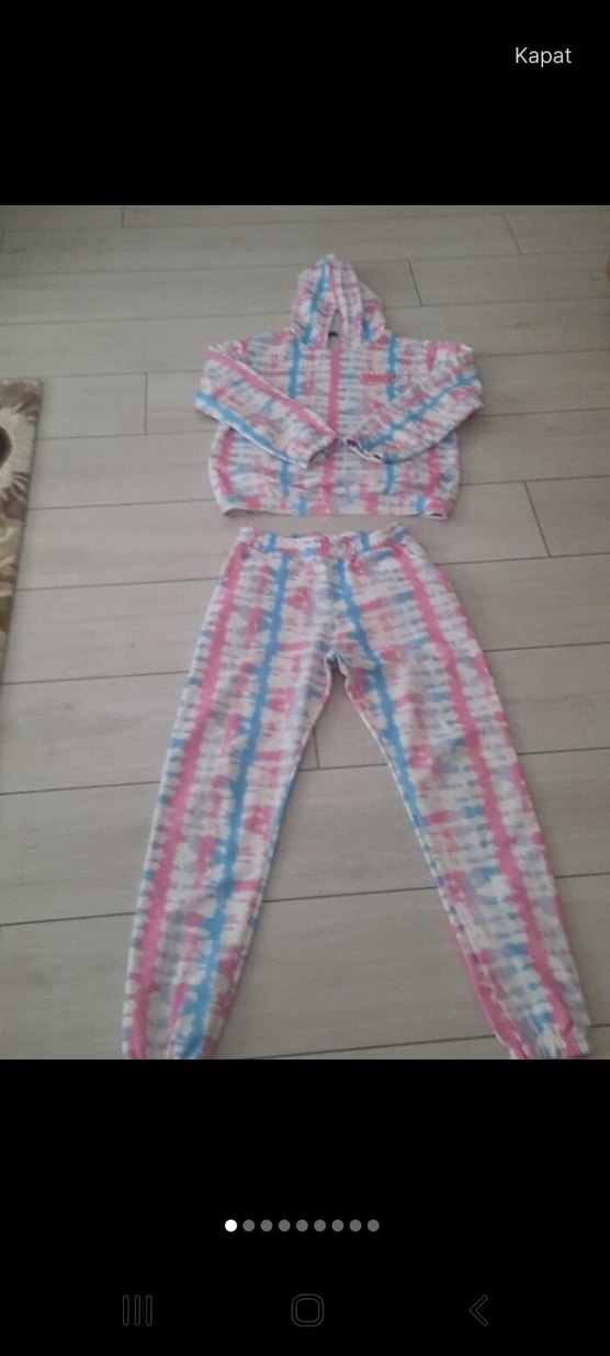 Kızlar için çok renkli pastel tie-dye desenli, bol kesim eşofman takımı. Kapüşonlu üst kısmı dantel detaylı ve askılı kolludur, yumuşak sentetik kumaştan yapılmıştır.
