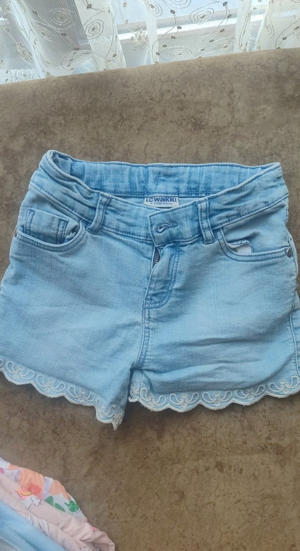 Kızlar için loose fit mavi denim şort, etek ucu dantel işlemeli, sade ve rahat bir tarz sunar.