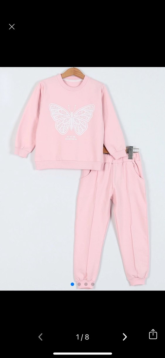 Yumuşak polar kumaştan yapılmış, dantel detaylı kelebek baskılı uzun kollu, yuvarlak yaka, bol kesim pembe kız eşofman takımıdır.