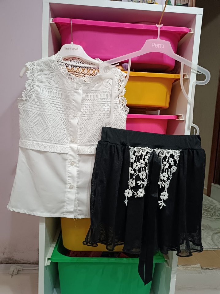 Kızlar için dantel işlemeli beyaz bluz yüklü etek takım