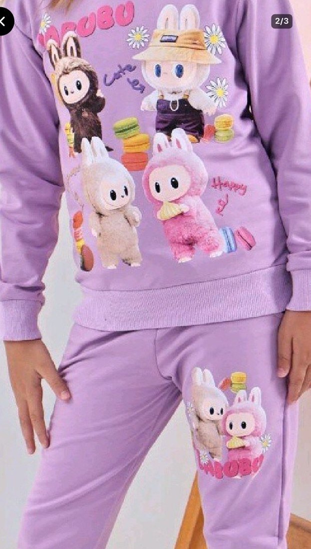 3 yaş ve 12 yaşları arasında mevcuttur.Mor renkli, uzun kollu, bisiklet yaka sweatshirt ve eşofman takımı. Pastel tonlarda, baskılı figürler ve dantel detaylarıyla rahat kesim.renkleri ve bedenleri mevcuttur mağaza ürünüdür adet fiyatı