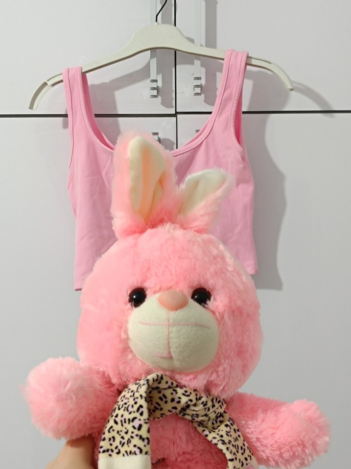 Kızlar için pembe, dantelli, halter yaka ve kolsuz, hafif batik desenli, sentetik yumuşak kumaştan yapılmış dar kesim atlet.