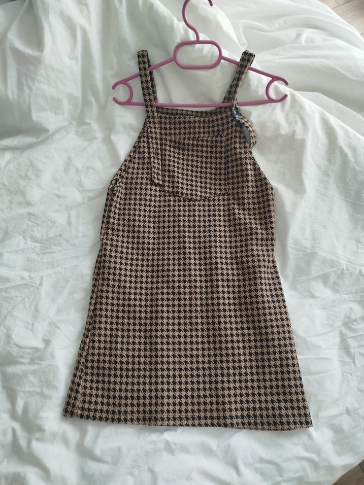 Kızlar için düğmeli, askılı kahverengi elbise. Sentetik kumaştan, bol kesim ve straplez yakaya sahip, sokak modasına uygun.