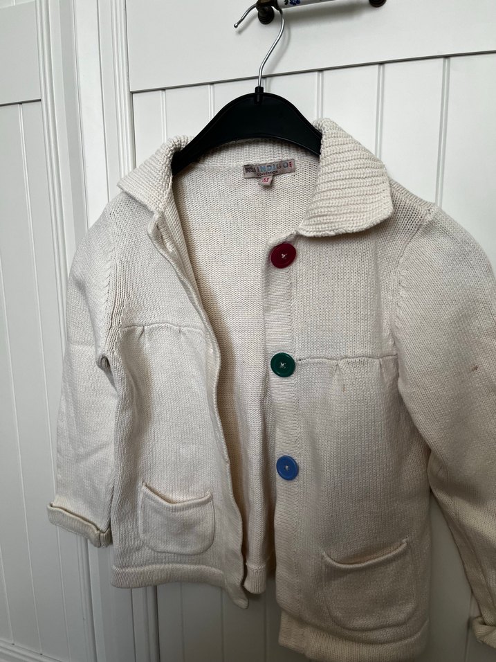 Biraz lekeleri var yikayinca cikar mi bir fikrim yok Uzun kollu, bol kesim beyaz yün hırka, renkli düğmeler ve iki ön cep ile sokak stiline uygun.