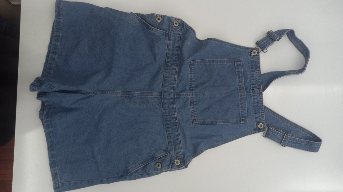 Kızlar için düğmeli, bol kesim, kısa kollu kot tulum. Sokak stili için uygun, sırtında büyük cep bulunur.mavi renklidir.