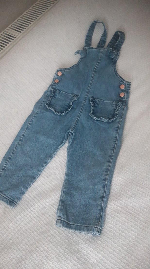 Kızlar için düğmeli, bol kesim kot tulum. Ön cepleri ve askılı tasarımıyla gri-mavi tonlarında, sokak stiline uygun.