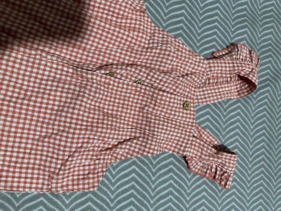 Kızlar için keten kumaştan, düğmeli, kareli desenli, yakalı, askılı kollu ve bol kesim gömlek. Sokak tarzı için uygundur.