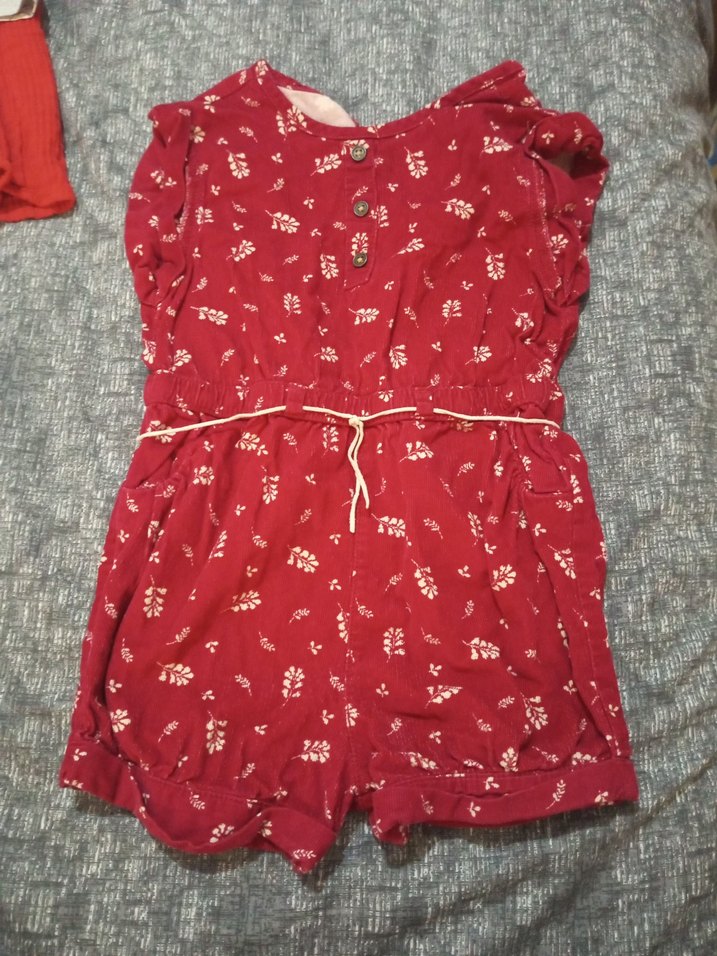 Kızlar için düğmeli, kırmızı, kolsuz tulum. Yumuşak kumaştan, bol kesim ve bohem tarzda.