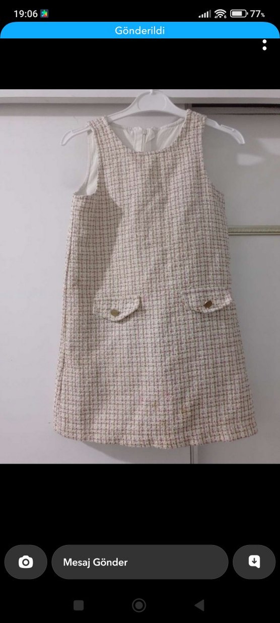 Kolsuz, düğmeli detaylı bej kız elbisesi. Notlu yakalı, yumuşak sentetik kumaştan, rahat kesim, günlük sokak stili için uygundur.