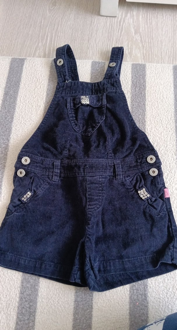 Düğmeli askılı, cepli ve sade desenli mavi kot kumaştan yapılmış kız çocukları için dar kesim tulum şort.