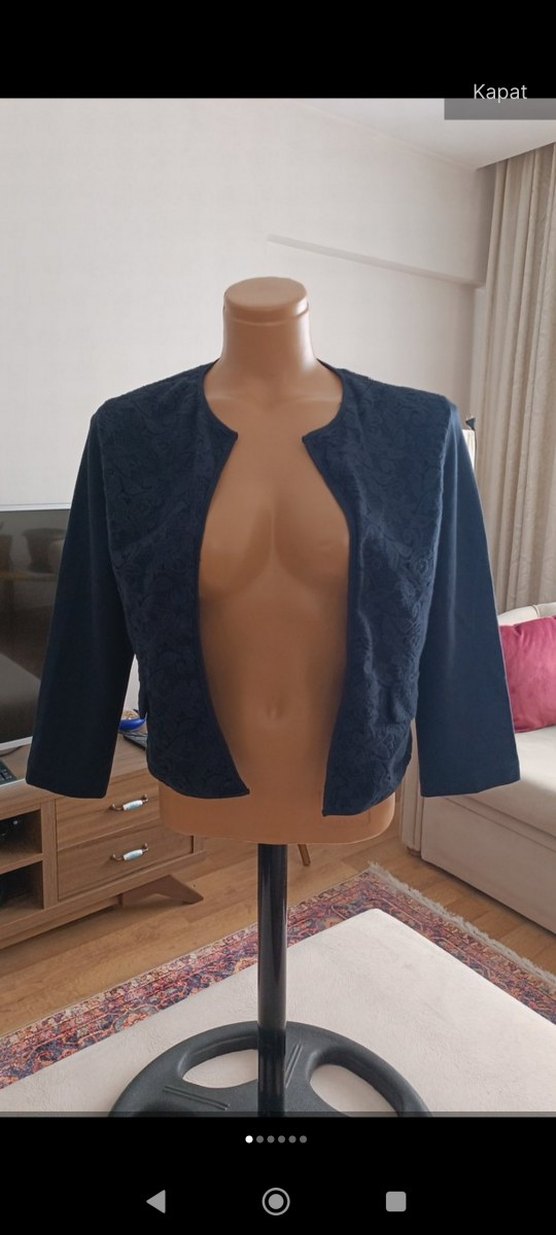 Kızlar için fitted kesim, düğmeli, notched lapel yakalı lacivert bolero. 3/4 kol ve penye tok kumaştan yapılmıştır. rengi koyu laciverttir ışıktan soluk çıkmış eser miktarda kedimin beyaz tüyü yapışmış olabilir