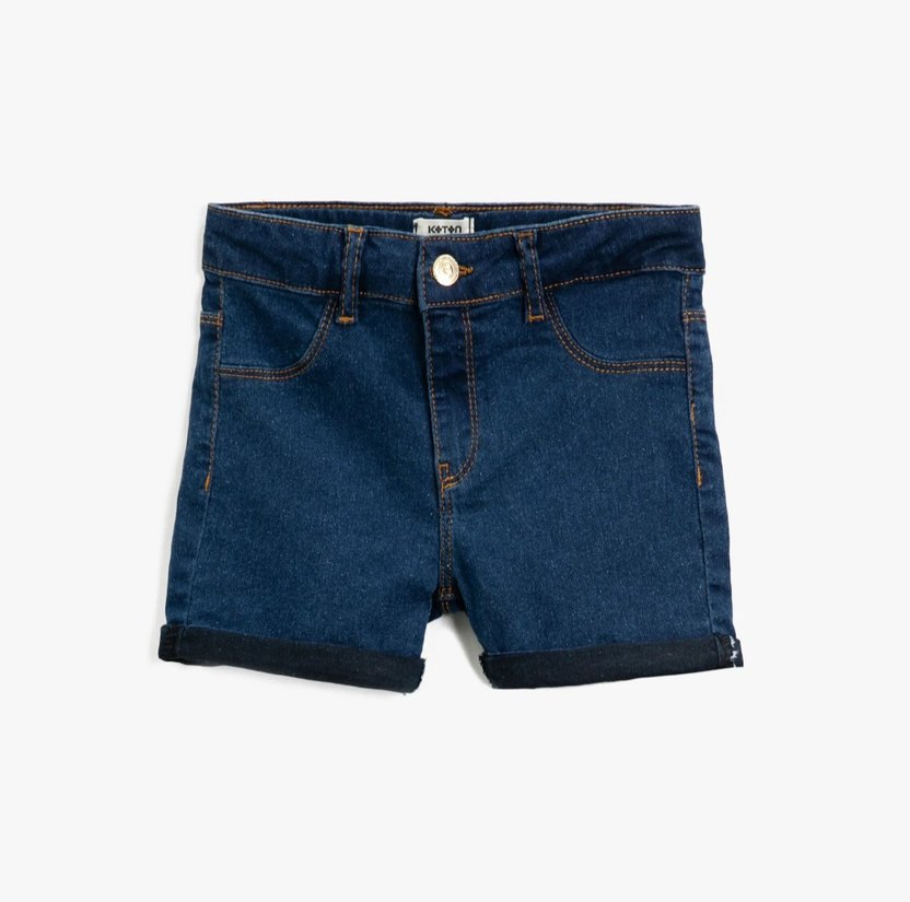 Kızlar için düğmeli, mavi renkte, denim şort. Sokak stiline uygun.beli ayarlanabilir aparatlı
