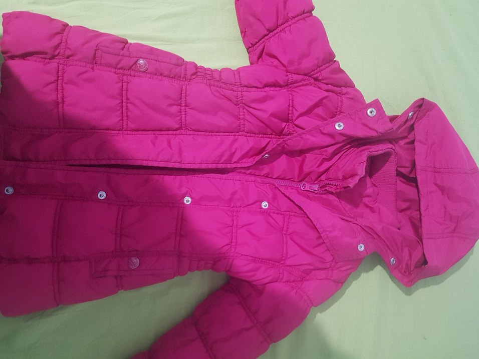 Düğmeli, parlak pembe, yumuşak ve sıcak kumaştan yapılmış, kesimli kız montu. Notch yaka ve günlük sokak tarzı için uygundur. 110 cm