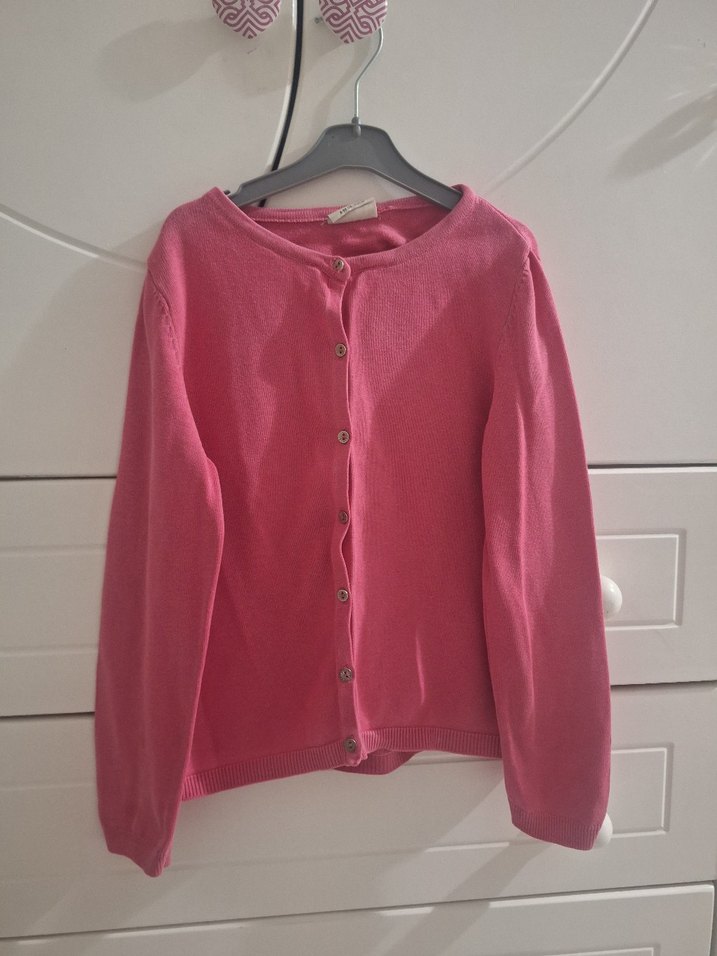 Pembe renkli, uzun kollu, düğmeli ve bol kesim kız hırkasıdır. Düz ve sade tasarımıyla günlük kullanıma uygundur.