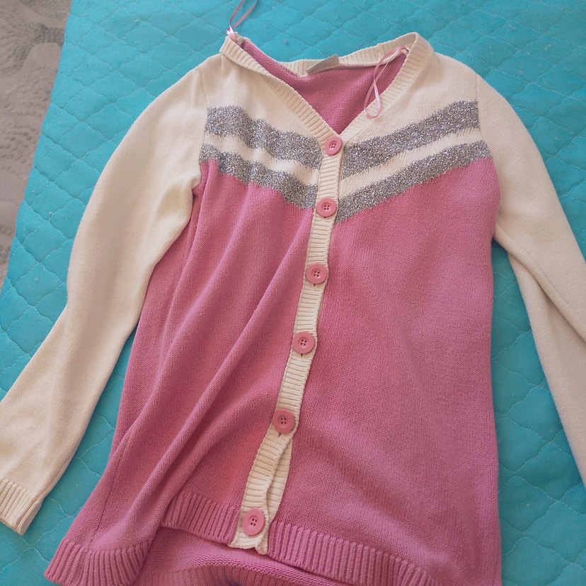 Kızlar için pembe renkli, düğmeli, uzun kollu, triko hırka. Pastel tonlarda, sade çizgili detaylara sahip, bol kesim.