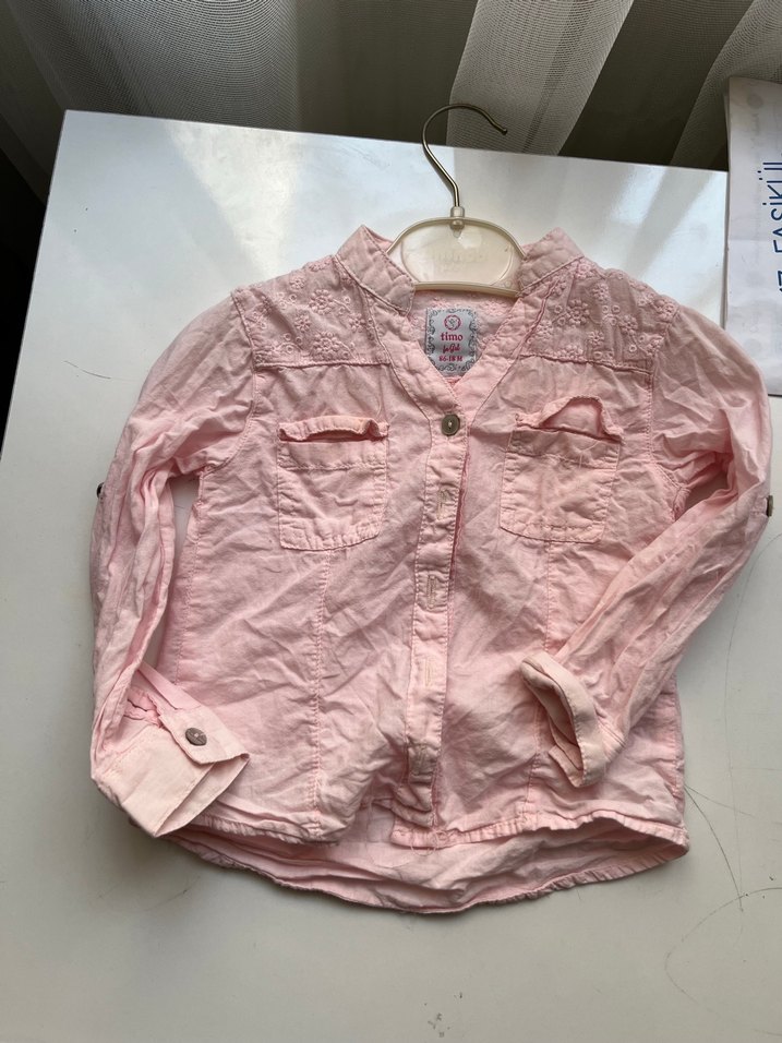 Pembe keten kumaştan, düğmeli ve yakalı uzun kollu kız gömleği. Rahat kesimi ve sade tasarımıyla günlük kullanıma uygun.