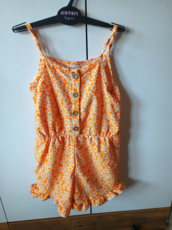 Düğmeli, kolsuz, bol kesim kız tulumu. Canlı turuncu renk ve desenli, sentetik kumaştan, sokak stili için uygun.