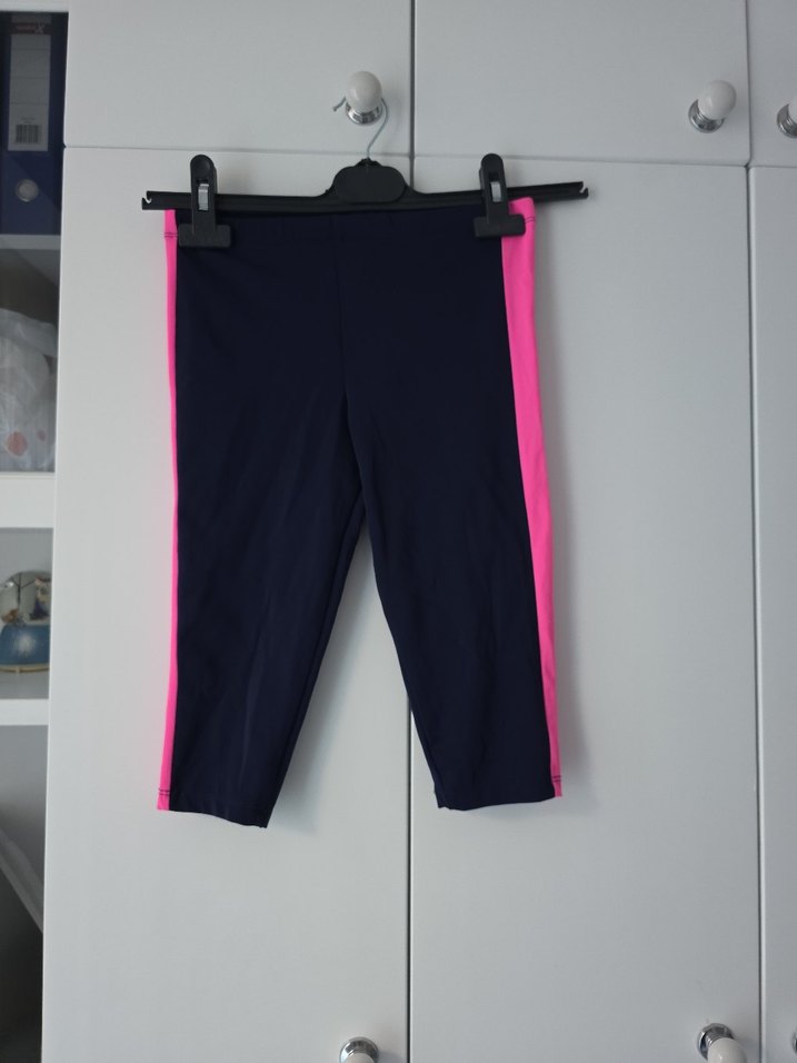 Elastik bel bantlı, koyu renkli sentetik kumaştan yapılmış, yanları parlak pembe şeritli kızlar için dar kesim sokak stili pantolon.