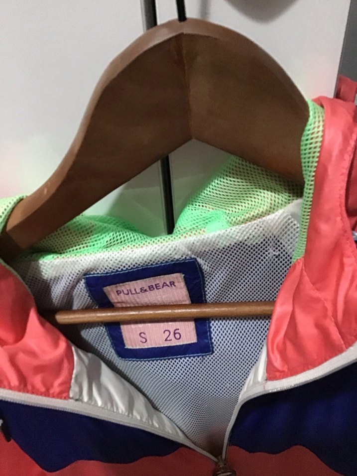 Fermuarlı ve bisiklet yaka, sentetik kumaştan yapılmış, pastel çok renkli baskılı, fitted kesim kızlar için ceket. Pull&Bear markası.