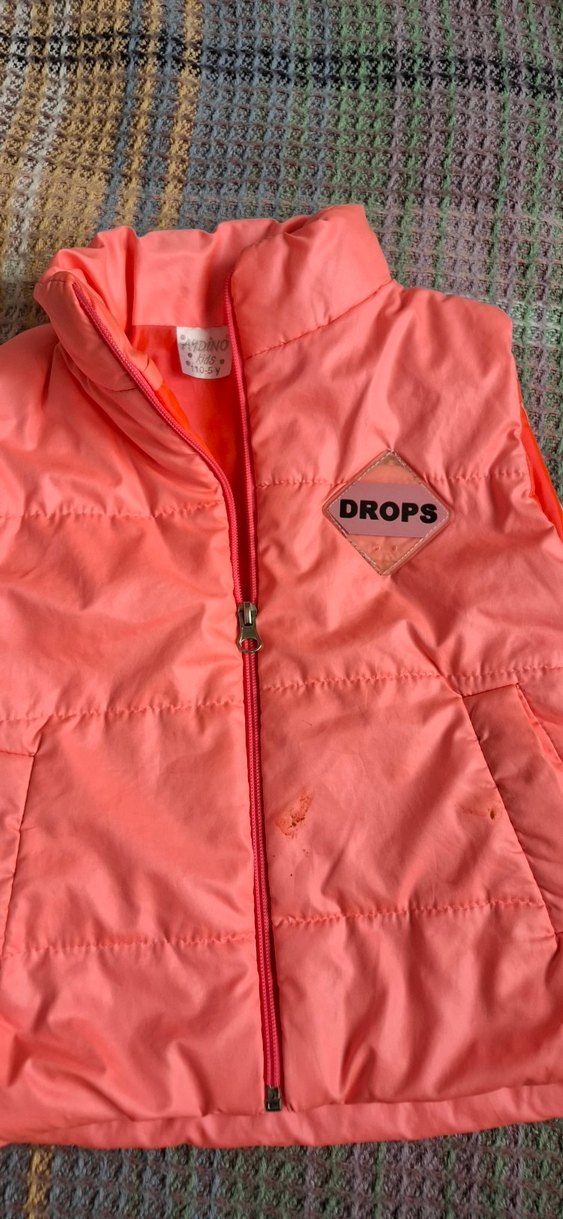 Kızlar için fermuarlı, parlak pembe renkli, baskılı "DROPS" yaması bulunan, yumuşak dokulu, fitted kesim street wear yelek.