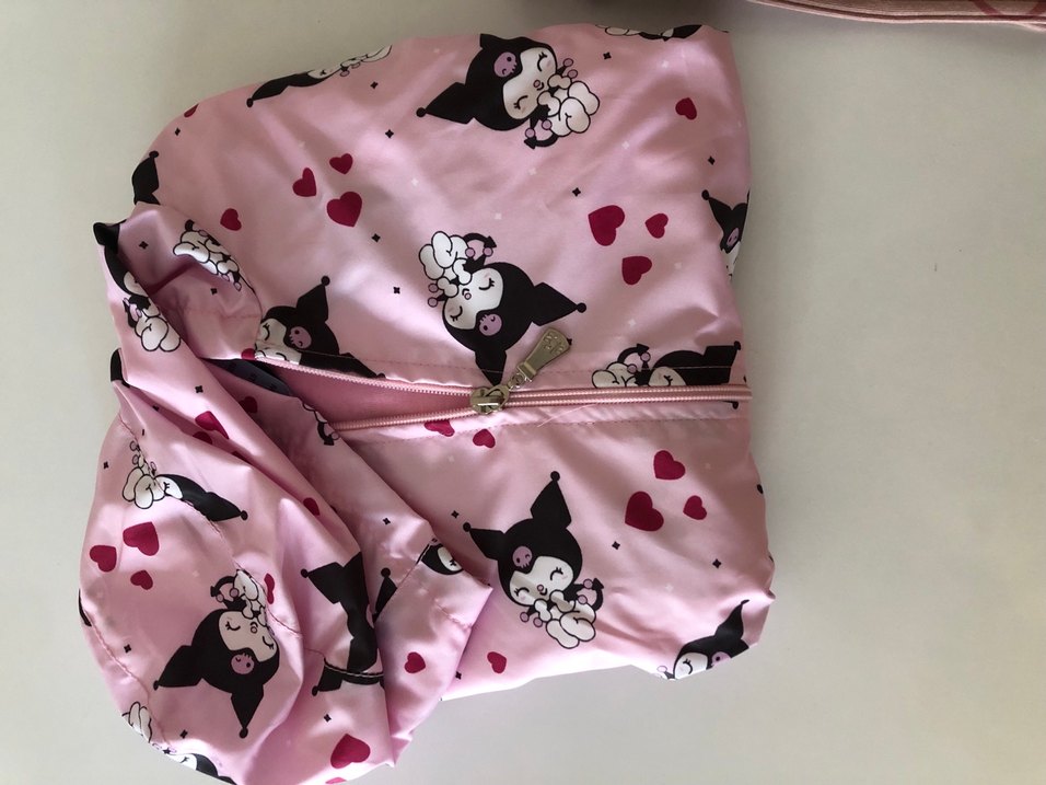 Kızlar için fermuarlı, V yaka, pembe pastel renkli baskılı sentetik kumaştan yağmurluk. Sokak tarzı ve dar kesim. ️