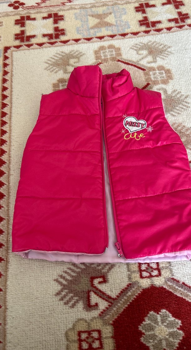 Kızlar için fermuarlı, pembe renkli, desenli ve ince kesim yelek. Yumuşak ve sıcak tutan kumaştan, trend sokak stiline uygun.