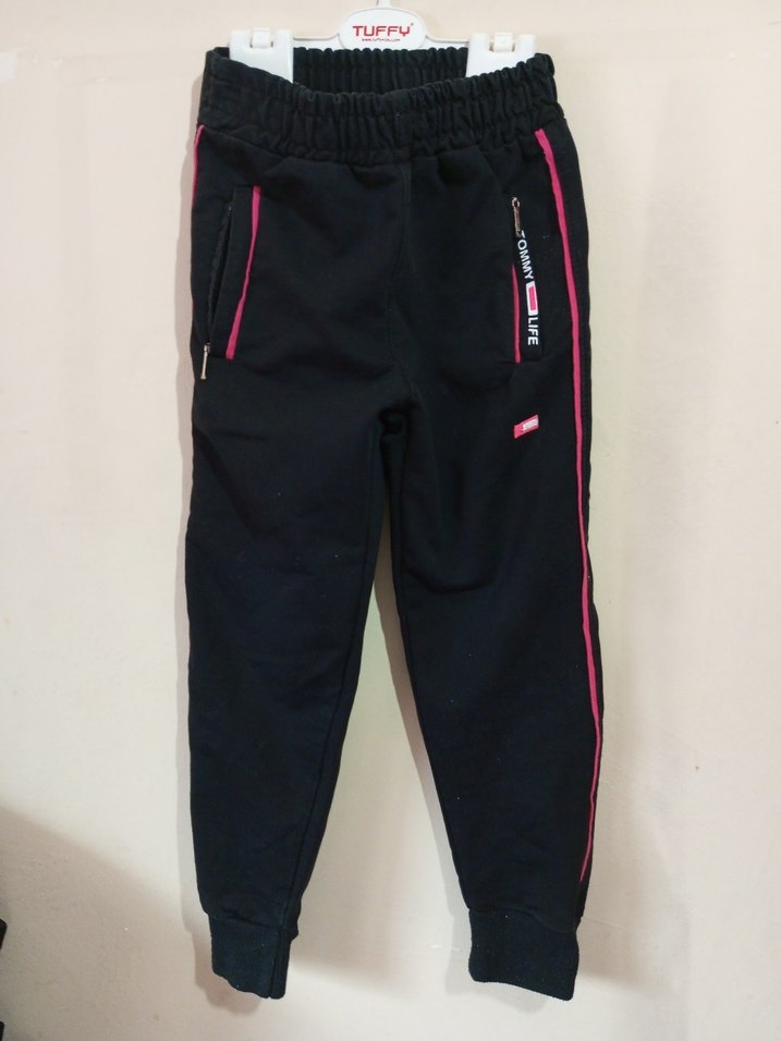 Kızlar için fermuarlı cepleri ve pembe yan şeritleri olan siyah, yumuşak ve rahat kumaştan eşofman altı. 5-6 yaşa uygun sıfır ayarında.