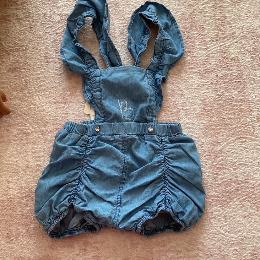 Kızlar için bol kesim, fırfırlı askılı ve işlemeli detaylı denim salopet. Mavi renk ve gri işlemeye sahip.