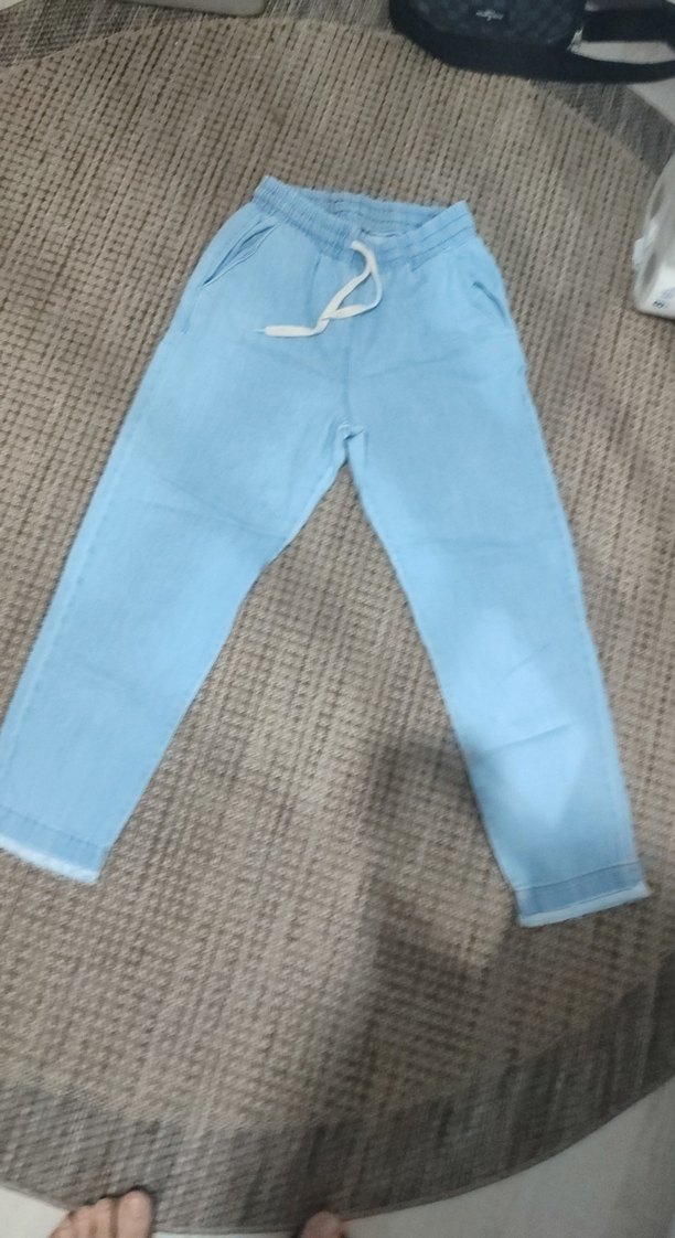 Kızlar için gevşek kesim, pastel mavi kot pantolon. Rahat bağcıklı bel ve desen içermeyen tasarımıyla trend, gündelik bir görünüm sunar.