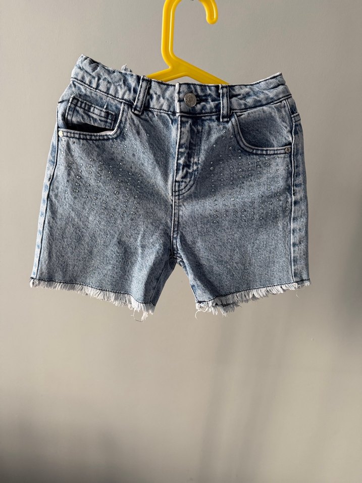 Gri batik desenli, bol kesim kız çocuk denim şort, sokak modası ve zahmetsiz şıklığı bir araya getiriyor.