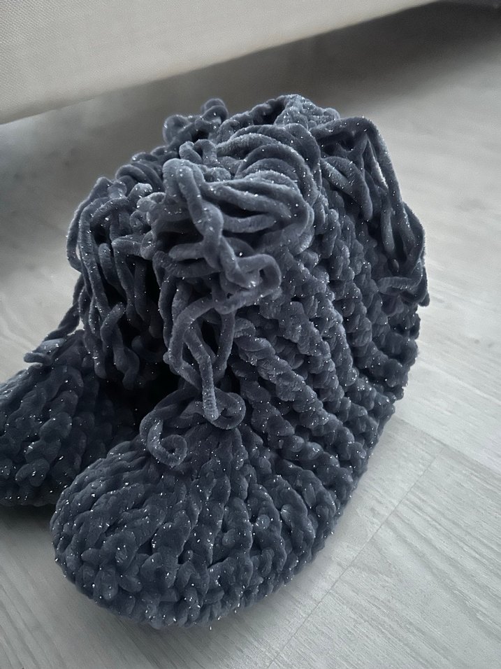 Kızlar için gri renkte, bohem tarzda, örgü dokulu sıcak terlik. Yumuşak ve rahat yapısıyla dikkat çeker.