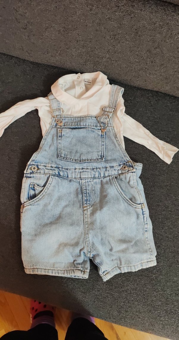 Kızlar için askılı, tokalı gri denim şort tulum. İçinde beyaz, kolsuz tişört ile rahat ve salaş şehir stili sunar.
