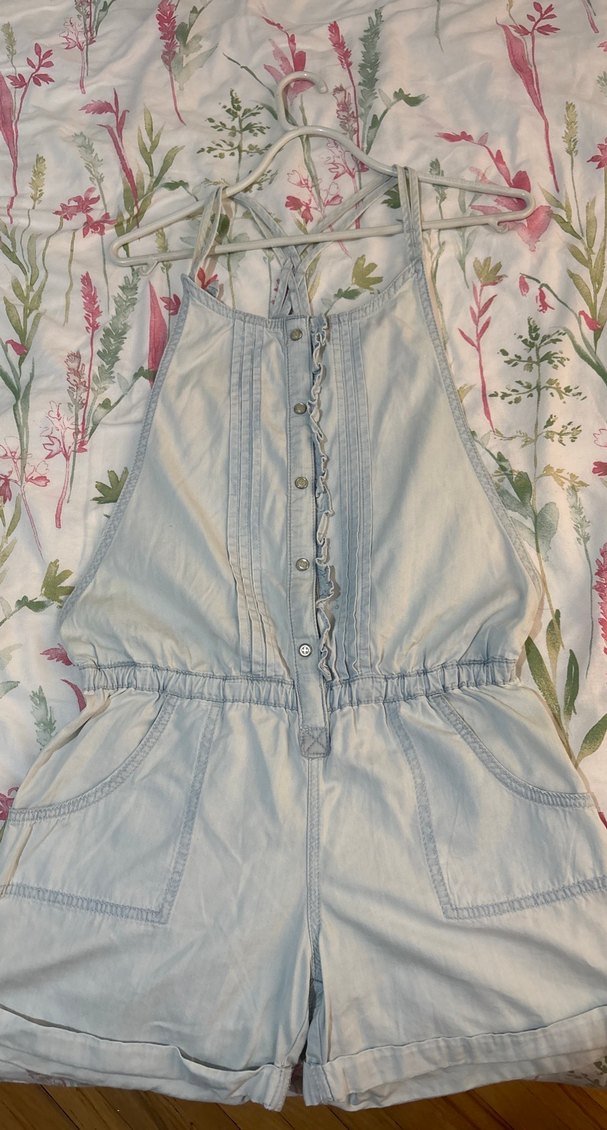 Gri pastel tonlarda, düğmeli, bol kesim, kolsuz denim kız tulumu. Ön cepler ve bohem tarz detaylarıyla.